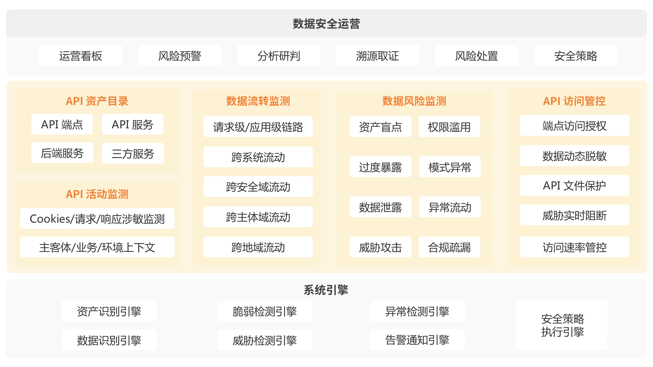 全面多维感知,数据风险从未知到已知AG旗舰厅(中国) uDSP 给予多维数据安全风险分析与实时监测能力,顺利获得脆弱性检测引擎、威胁检测引擎、异常行为分析引擎和告警通知引擎,全面感知 API 资产的脆弱性、威胁攻击、数据访问异常行为等风险。企业可以顺利获得自定义 UEBA 告警、精确阈值告警等功能,实时监测数据安全风险,及时发现并处置异常行为。